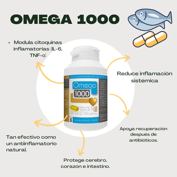 Omega 1000 Tegor aporta EPA y DHA, modulando las citoquinas inflamatorias, protegiendo el sistema digestivo, cardiovascular y energético, y favoreciendo la recuperación del bienestar general.