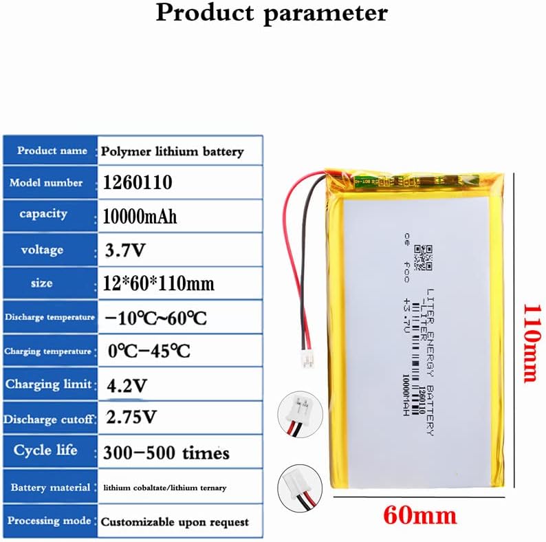 - Model: 1260110;Voltage: 3.7volt; Capacity: 10000mAh;Maximum Charge Voltage/Current: 4.25V/5000mAh; Material: Lithium Polymer.