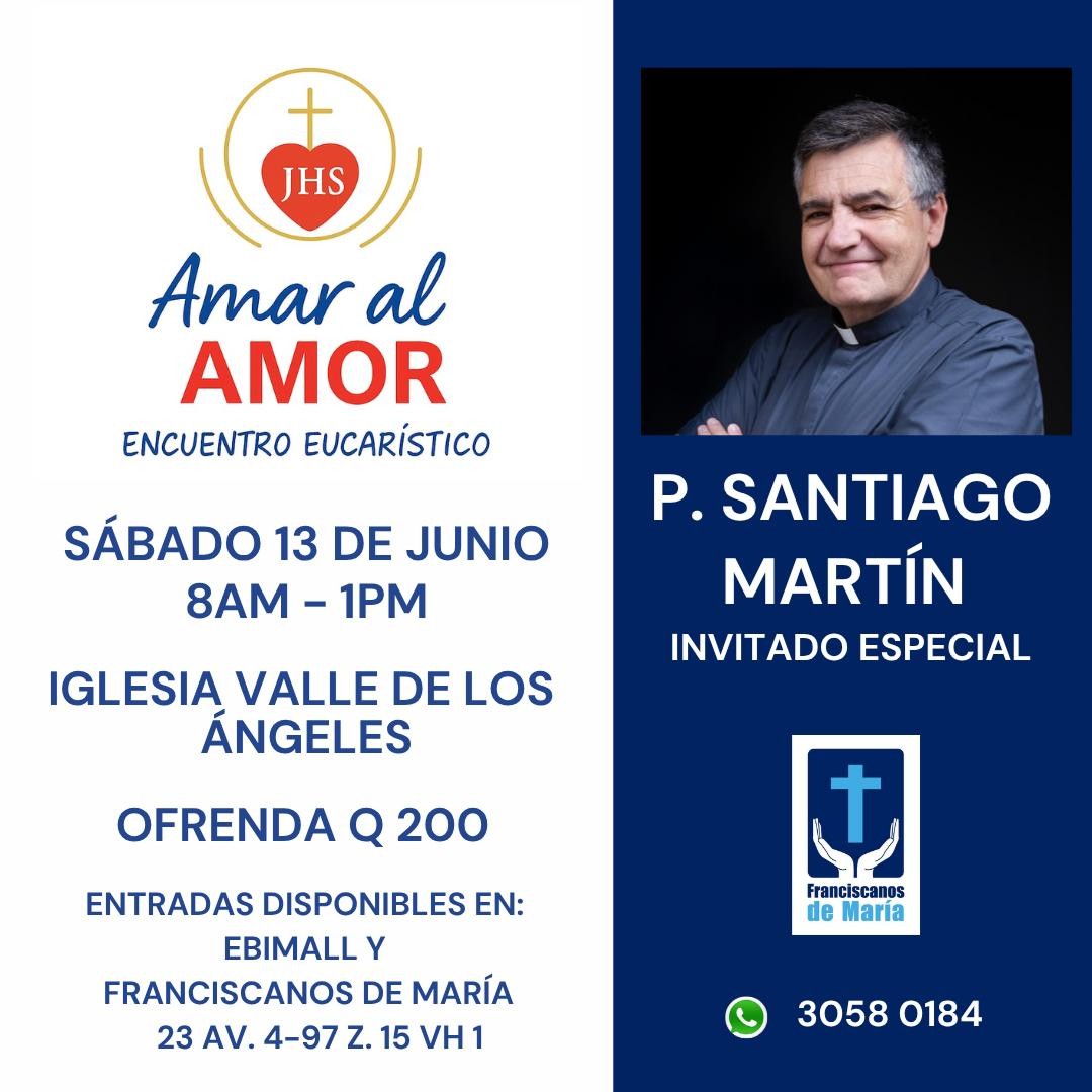 Amar al Amor: Encuentro Eucarístico con el P. Santiago Martín Organizado por Franciscanos de María Te invitamos a participar de un retiro espiritual en el que Jesús Eucaristía te llenará de su amor y su paz. Las charlas estarán a cargo del P. Santiago Martín, fundador de los Franciscanos de María, misioneros del agradecimiento, quien nos visita desde Madrid, España.