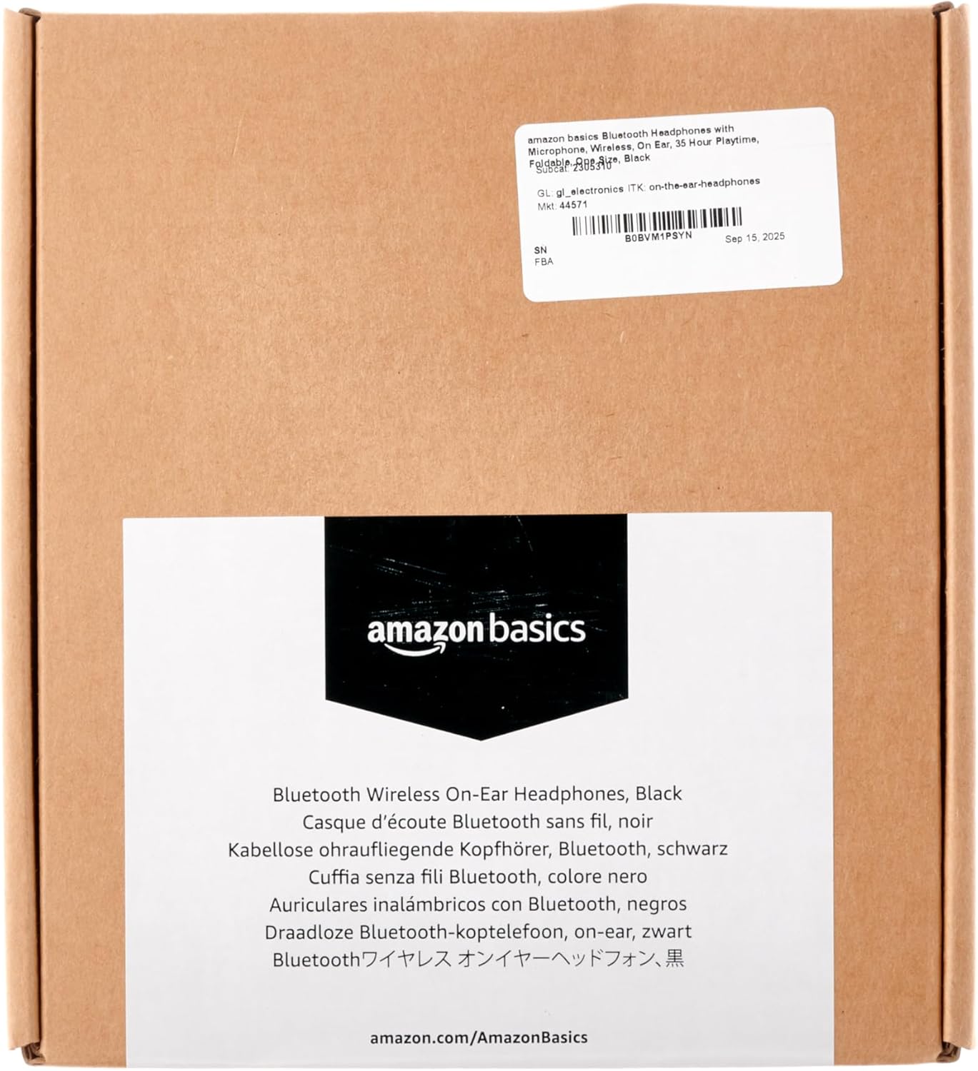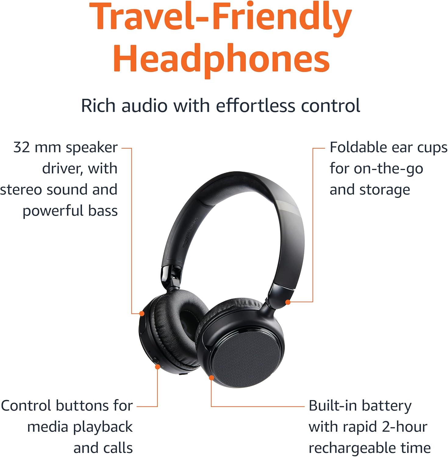 Amazon Basics Auriculares Bluetooth inalámbricos con micrófono, en la oreja, tiempo de reproducción de 35 horas, plegables, tamaño único, plegable, apto para viajes, color negro