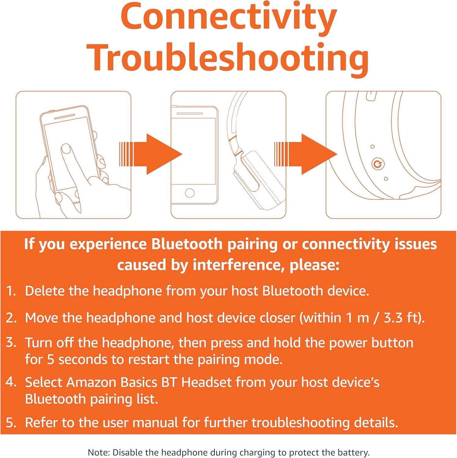 - SOLUCIÓN DE PROBLEMAS DE CONECTIVIDAD: Los auriculares se desactivan durante la carga para proteger la batería. Si experimenta problemas de conectividad o emparejamiento Bluetooth en otras situaciones, intente lo siguiente: 1. Elimine los auriculares de su dispositivo Bluetooth anfitrión. 2. Mueva los auriculares y su dispositivo host más cerca (dentro de 3.3 ft/3,3 pies). 3. Apague los auriculares y, a continuación, mantenga presionado el botón de encendido durante 5 segundos para reiniciar el modo de emparejamiento. 4. Selecciona Amazon Basics BT Headset de la lista de emparejamiento Bluetooth de tu dispositivo anfitrión. 5. Consulte el manual del usuario para obtener más detalles sobre la solución de problemas.