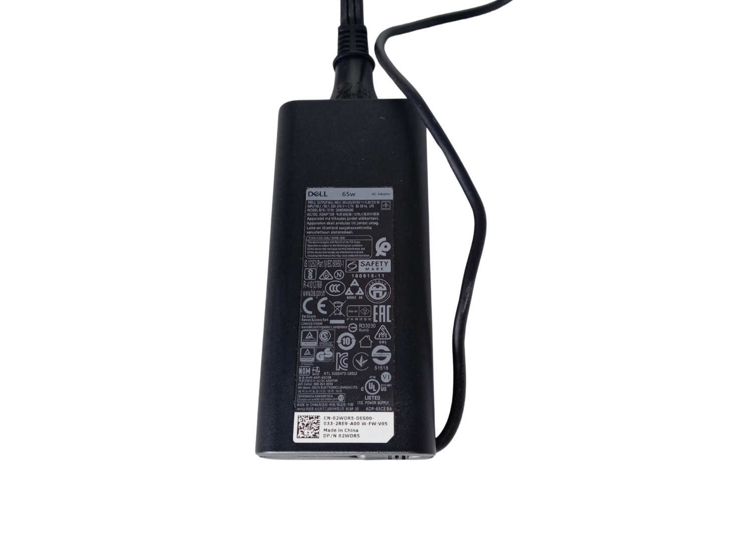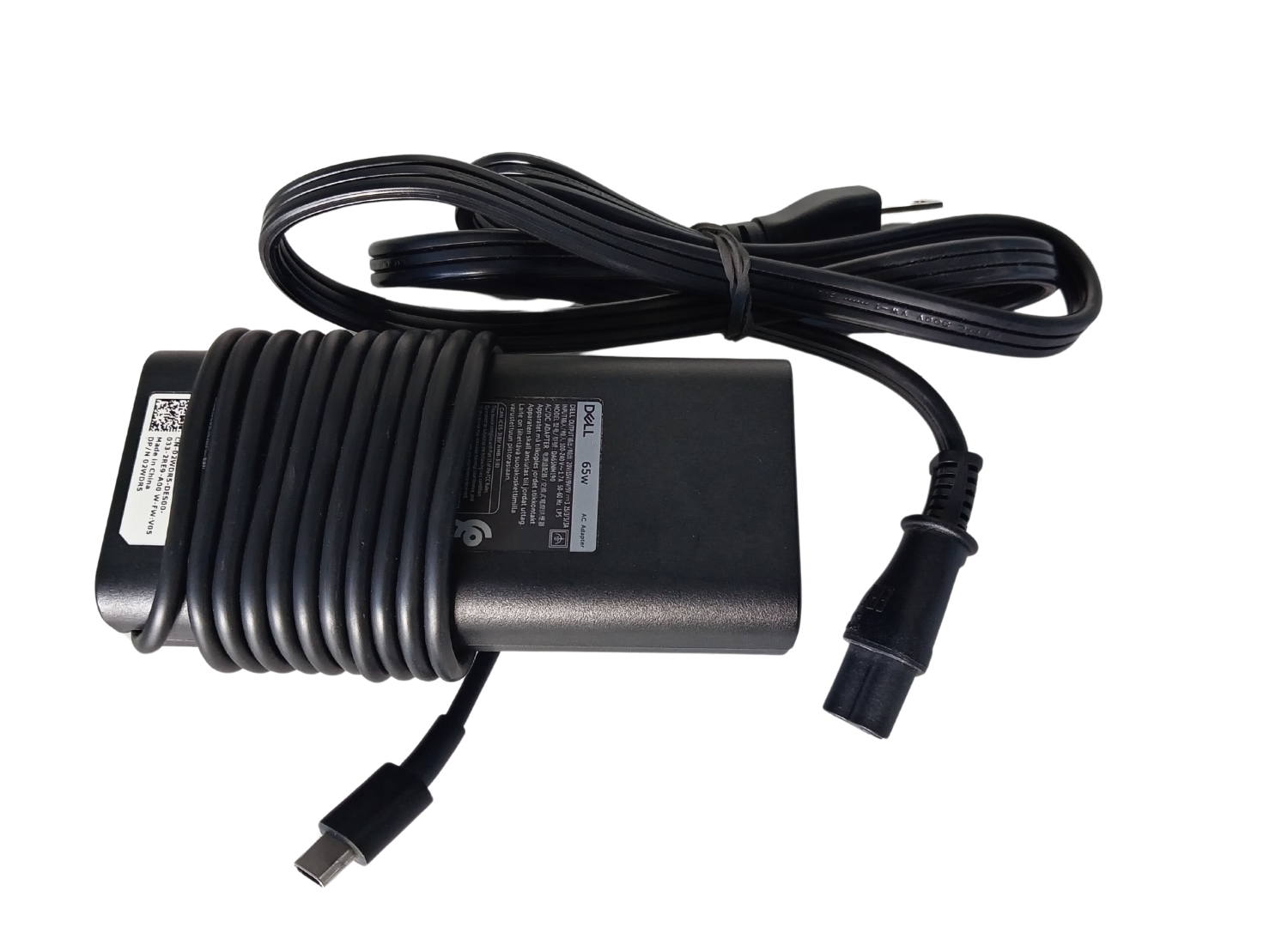 El adaptador de CA de 65 W de Dell™ está especialmente diseñado para satisfacer las necesidades de energía de su computadora portátil Dell™. Con una potencia de 65 W, este adaptador le permite operar simultáneamente su sistema y cargar su batería desde tomas de corriente eléctricas. *Utiliza el puerto de carga tipo C de su portátil*.
