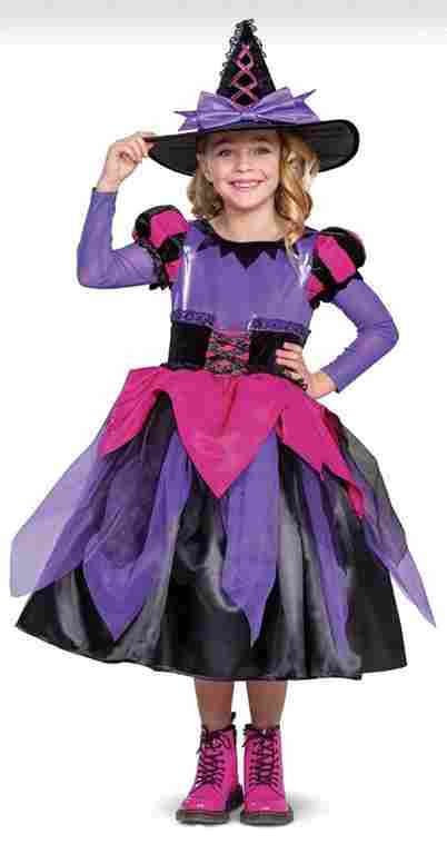 Completa el look con el clásico gorro de punta de bruja a juego, que añade un toque auténtico al atuendo.