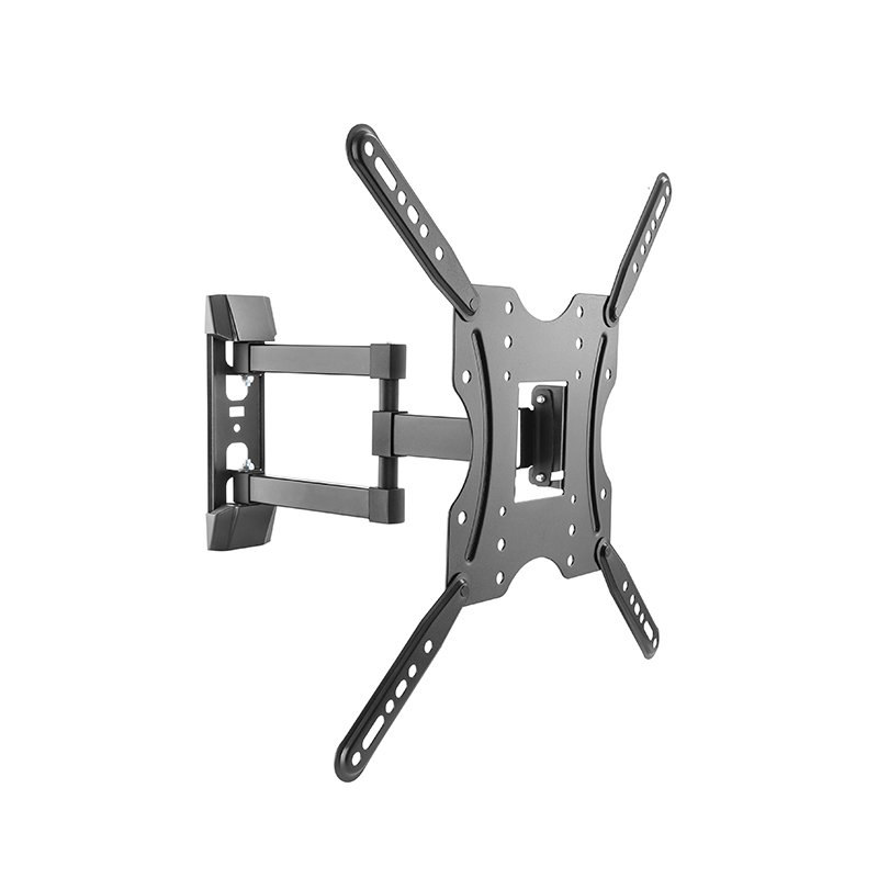 Soporte de pared para TV de 32″ a 55″, con movimiento completo, perillas de fácil agarre, brazos giratorios y diseño abierto que mejora ventilación y acceso a cables. Capacidad de carga: hasta 30 kg.