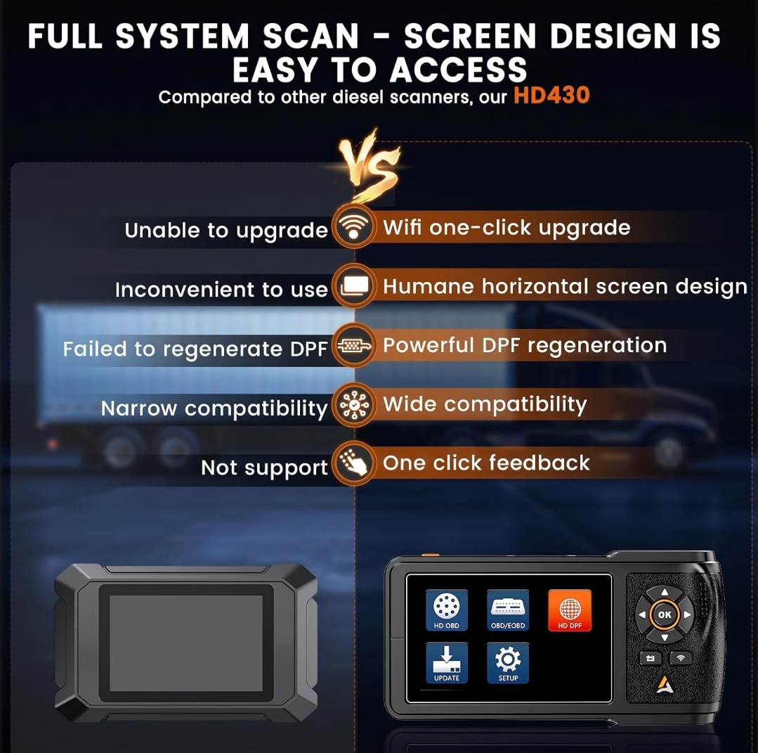 • Amplia compatibilidad: HD430 soporta camiones de 12 V 24 V, equipado con conectores diésel (CAT-9, Diesel de 6 pines y 9 pines) y OBDII de 16 pines, con una fuerte adaptación y compatibilidad de camiones. El producto es compatible con protocolos SAE J1939, SAE J1708, SAE J1850 PWM, SAE J1850 VPW, ISO 14230-4, ISO 9141-2, ISO 15765-4, ISO 27145-4, proporciona escaneo completo y escaneo rápido, y disponible en inglés y spanish anish, es adecuado para entusiastas del bricolaje, mecánicos de la vieja escuela, propietarios de camiones o pequeños talleres de reparación.