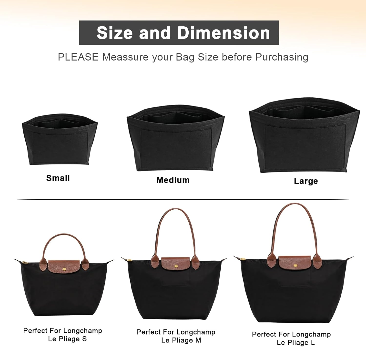 - Size of the felt purse organizer insert – Medium: 10.8″ (L)*6.3″ (W)*7.9″ (H) , suitable for Medium Size of long handle of Le pliage handbag, or similar size Tote Handbag,It will be more suitable if it is LESS than 0.5-1 inches to ensure a perfect fit,Please comfirm your bag size before purchasing again, thanks.