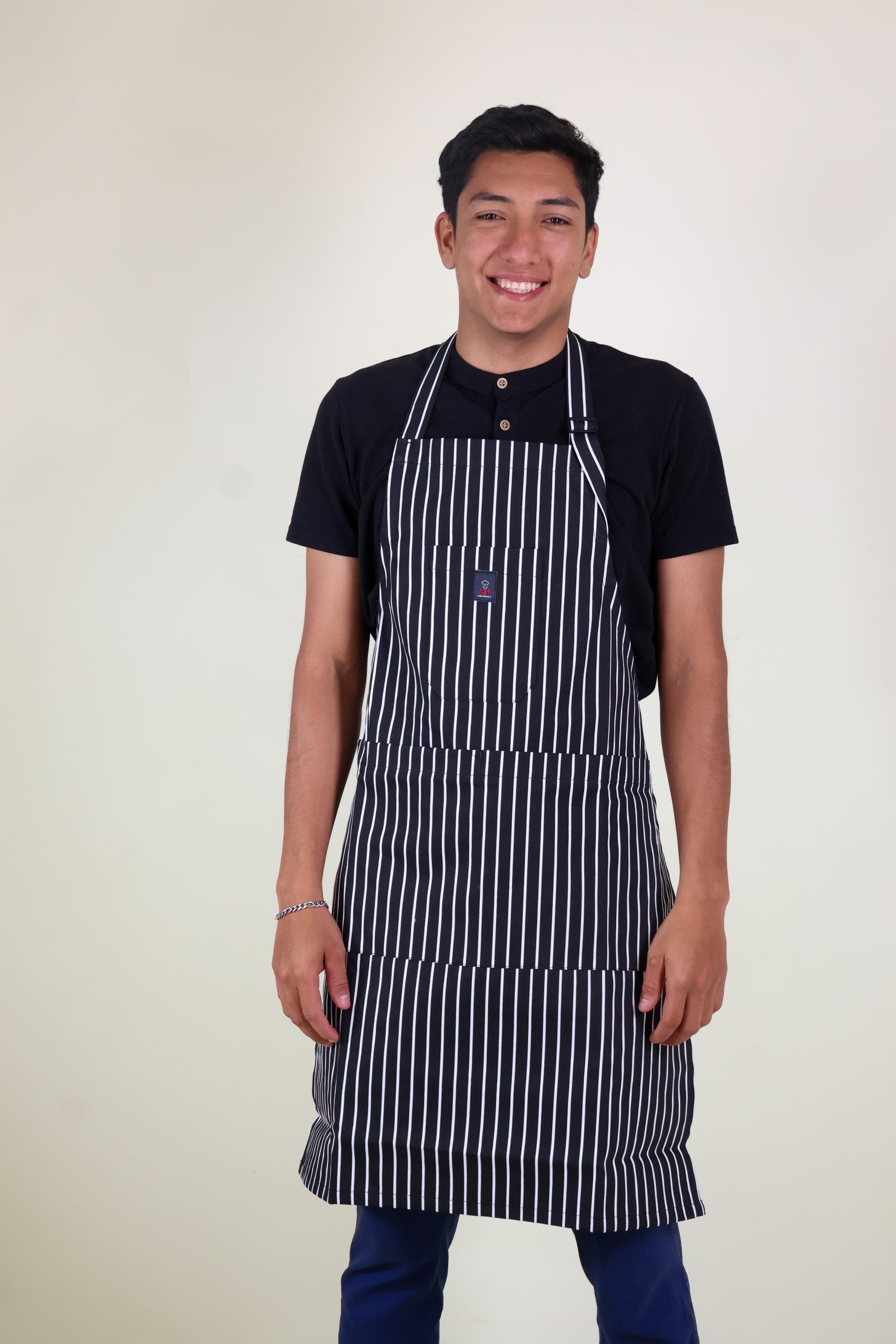 Gabacha para cocina de líneas negras y blancas, fabricada en una mezcla de poliéster y algodón. Con medidas de 32 cm de pecho, 55 cm de ancho y 74 cm de largo, es ajustable en el cuello. Cuenta con una bolsa para mayor practicidad. Fabricada en Guatemala, ideal para profesionales de la cocina.