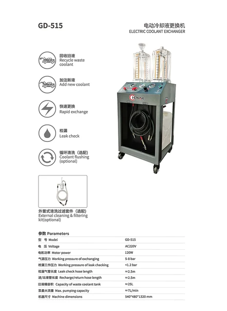 Con el respaldo del nombre HPMM de calidad superior, cada GD-515 está diseñado para lograr el máximo tiempo de funcionamiento y un menor mantenimiento. La máquina de reemplazo de refrigerante GD-515 ofrece el beneficio de una operación multifuncional en un diseño fácil de usar. La máquina de reemplazo de refrigerante GD-515 drena, enjuaga, enjuaga a contracorriente y llena, además de verificar el sistema de dos maneras para garantizar que no haya fugas y verificar la presión adecuada del sistema.
