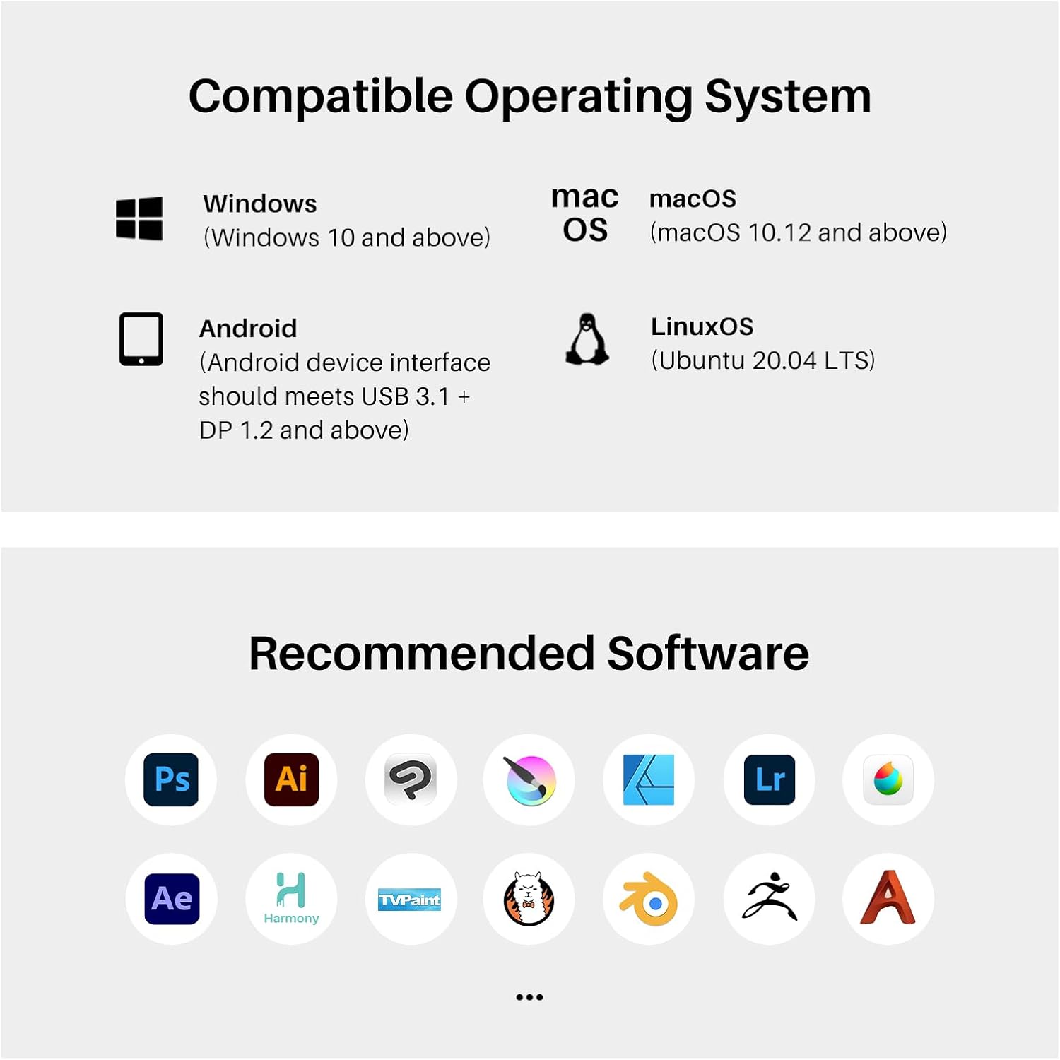 - Strong Compatibility: Kamvas 13 (Gen 3) pen display supports a variety of mainstream software. It is compatible with Windows 10 or later, Mac OS 10.12 or later, Android devices that support USB3.1 GEN1 and DP1.2, and Linux OS(Ubuntu 20.04 LTS).