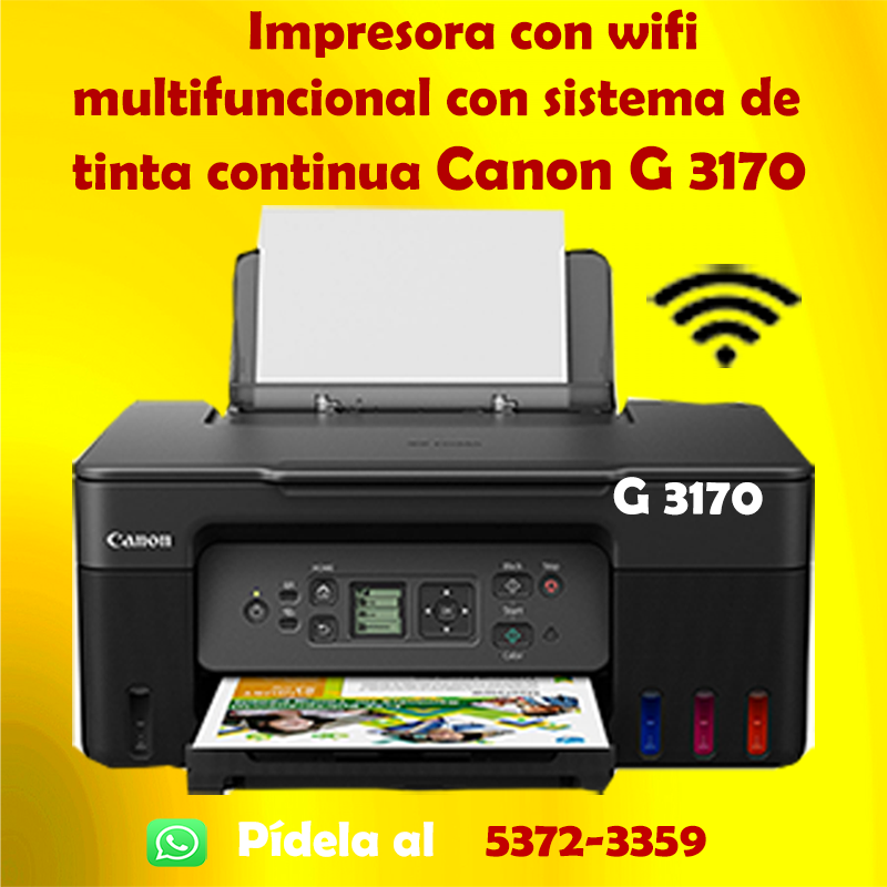 Diseñada para el hogar y oficinas en casa, la impresora MegaTank PIXMA G3170 de inyección de tinta multifuncional de Canon ofrece una impresión de alta calidad y bajo costo, así como una excelente conectividad inalámbrica en un tamaño compacto. Obtenga una gran productividad de impresión con un alto rendimiento de páginas de hasta 6,000 páginas en negro/7,700 páginas en color1 por cada juego completo de botellas de tinta y un bajo costo por impresión. MegaTank representa grandes ahorros.