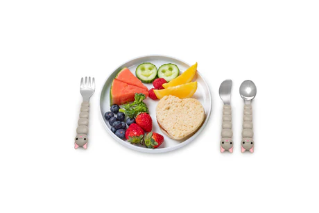Las cucharas hondas facilitan la preparación de alimentos para niños en edad preescolar y bebés que están aprendiendo a comer solos. Los tenedores tienen bordes redondeados que permiten que los niños coman solos. El cuchillo de acero inoxidable, apto para niños, es la manera perfecta de iniciar a los niños pequeños en el corte seguro de alimentos. Los mangos gruesos y redondeados son fáciles de sujetar por las manitas de los pequeños. Los extremos de nuestros cubiertos están diseñados para adaptarse fácilmente a las bocas de los más pequeños. Ideal para el destete guiado por el bebé.