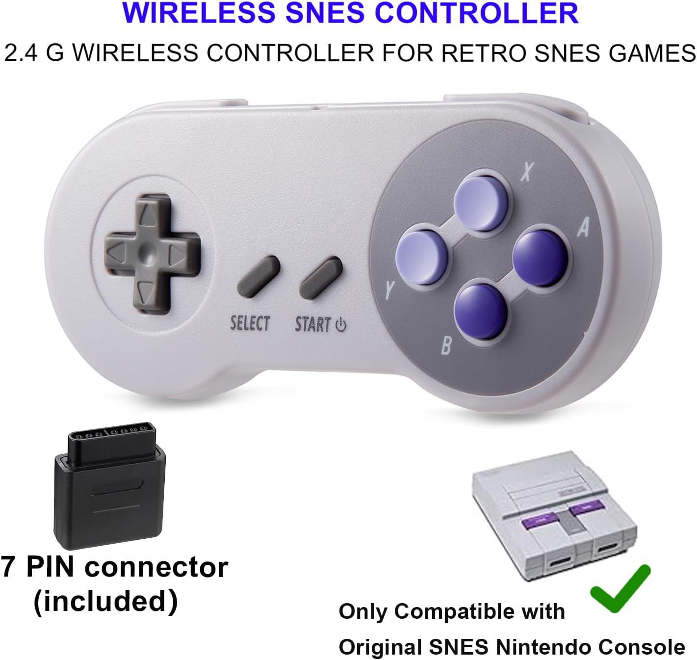 - 【2.4GHz Wireless connetion】2.4GHz Wireless technology and wireless range up 30 feets,that is better than having to sit on floor a foot away from the TV. 2.4G wireless connection,including wireless pairing 7 Pin Connector adapter for Original SNES console