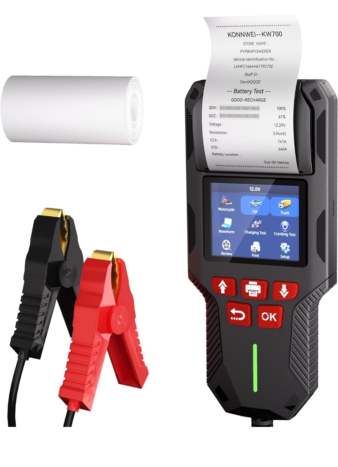 - Compatible con informes impresos personalizados: el probador de carga de batería KW700 tiene una impresora integrada que proporciona una impresión de informes clara y sin atascos, lo que te ayuda a ahorrar tiempo y dinero en la impresión. También es compatible con el nombre de la tienda personalizada, el VIN del vehículo y el número de personal para rastrear el estado de las diferentes baterías. Contiene 2 rollos de papel térmico, no requiere cinta de carbono, fácil impresión.