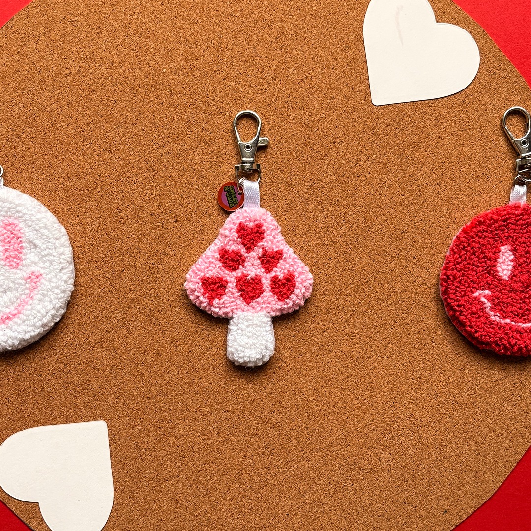 Hechos a mano con técnica de punch needle, estos llaveros están llenos de textura, color y buenas vibras. Son el accesorio perfecto para alegrar tus llaves, mochilas o bolsos con un toque retro y amoroso.