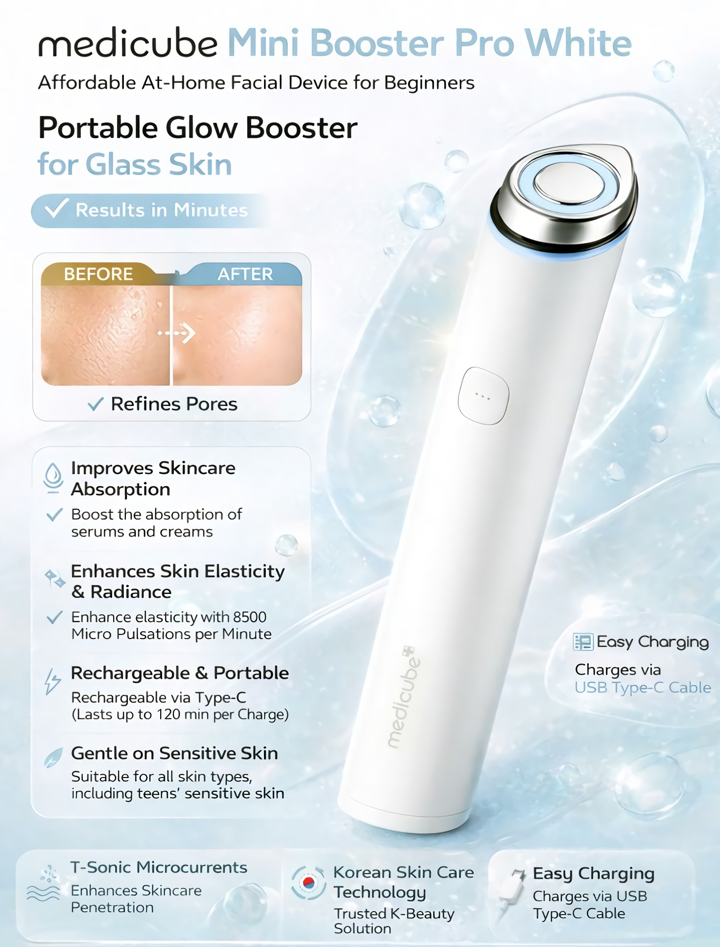 📝 Modo de Uso: Tras aplicar tu suero o crema Medicube, selecciona el nivel de intensidad y desliza suavemente el cabezal sobre el área deseada. Se recomienda su uso diario para mantener la zona iluminada y firme.