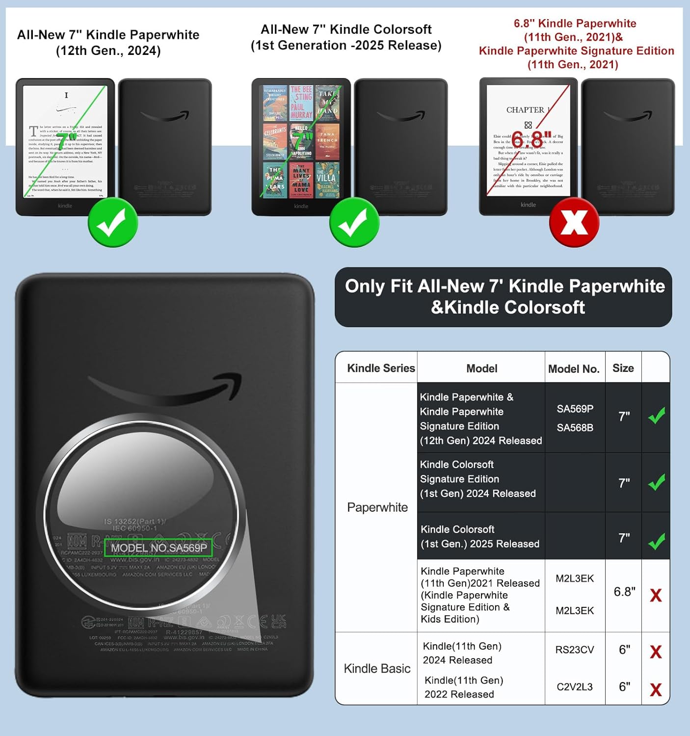 - For Kindle Paperwhite 2024/2025: Designed exclusively for 7″ All-New Kindle Paperwhite & Kindle Paperwhite Signature Edition (12th Generation – 2024 Release) and Kindle Colorsoft Signature Edition (1st Generation – 2024 Release) and Kindle Colorsoft (1st Generation – 2025 Release). Model: SA569P/SA568B. Not fit other prior generation Kindle devices.
