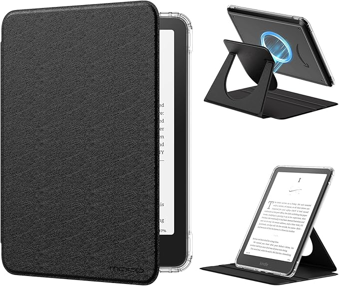MoKo 360° Rotating Case for 7″ Kindle Paperwhite 12th Generation 2024 & Kindle Colorsoft 2024/2025, Clear Back Detachable Magnetic Protective Adjustable Stand Cover with Auto Wake/Sleep, Black