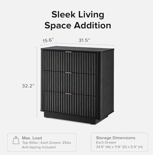 mopio Brooklyn – Cómoda negra de 3 cajones, cómoda moderna de mediados de siglo, credenza de madera, mesita de noche alta, soporte de TV para dormitorio, diseño de panel acanalado en forma de onda, perfil curvo, antivuelco