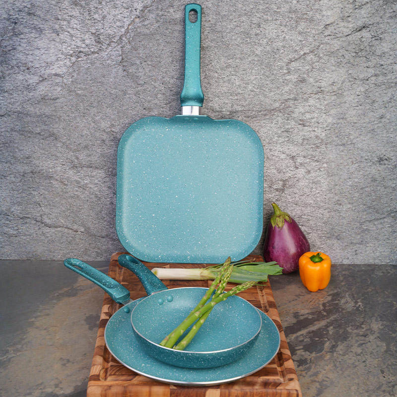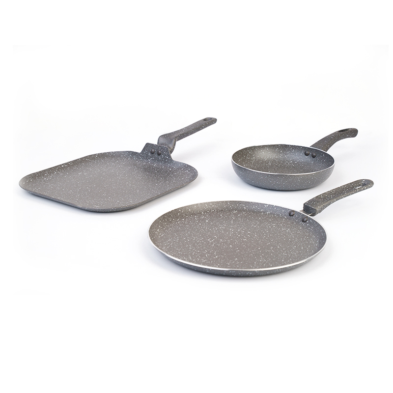 Juego de 3 piezas VELLETI: sartén 20 cm, sartén crepero 26 cm y plancha 28 cm. Fabricados en aluminio con recubrimiento antiadherente Dyflon de 2.2 mm de espesor, estos utensilios permiten una cocción uniforme, evitan que los alimentos se peguen y facilitan la limpieza. Los mangos resistentes al calor brindan seguridad y comodidad durante el uso.
