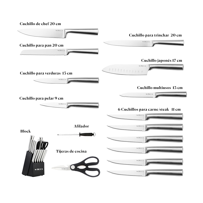 Ideal para amantes de la cocina y hogares que buscan herramientas de nivel profesional. El set de cuchillos profesionales PICCA de 16 piezas está diseñado para ofrecer precisión, equilibrio y máxima durabilidad en cada corte. Cada cuchillo cuenta con hojas de acero inoxidable de alto rendimiento, que mantienen el filo por más tiempo y resisten la corrosión, garantizando resultados perfectos tanto en uso doméstico como en entornos profesionales.