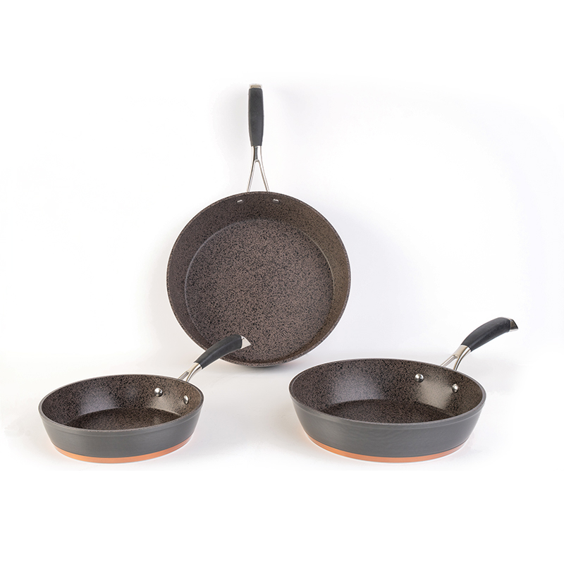 Set de sartenes Alte – 3 piezas. Incluye tres tamaños 28, 24 y 20 cm. Fabricados con recubrimiento antiadherente tipo mármol de 4.5 mm de grosor. Cuentan con mangos de acero inoxidable con agarre de silicón, base de inducción. Color Gris Grafito