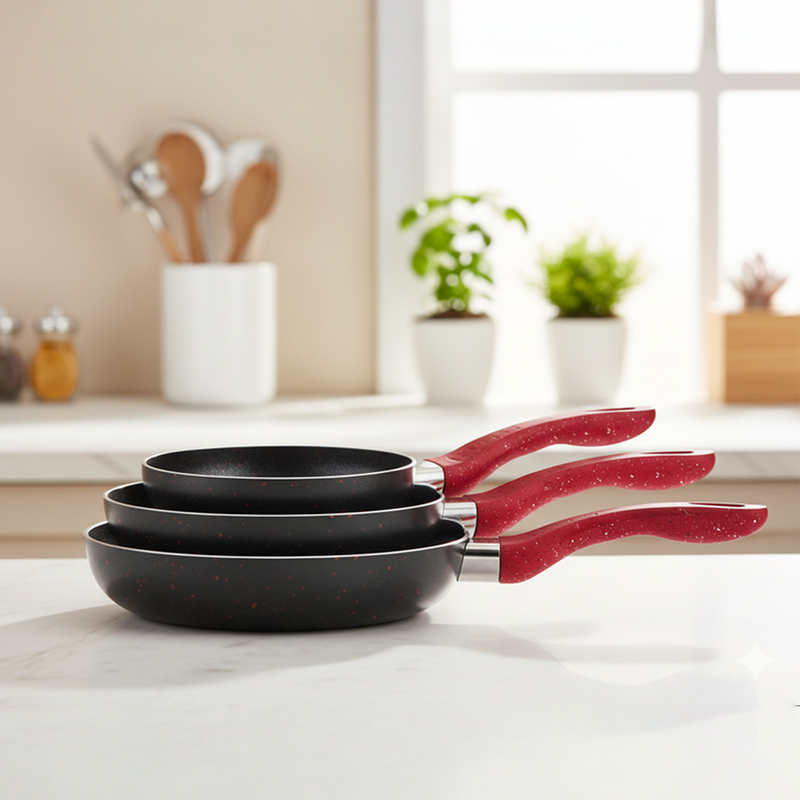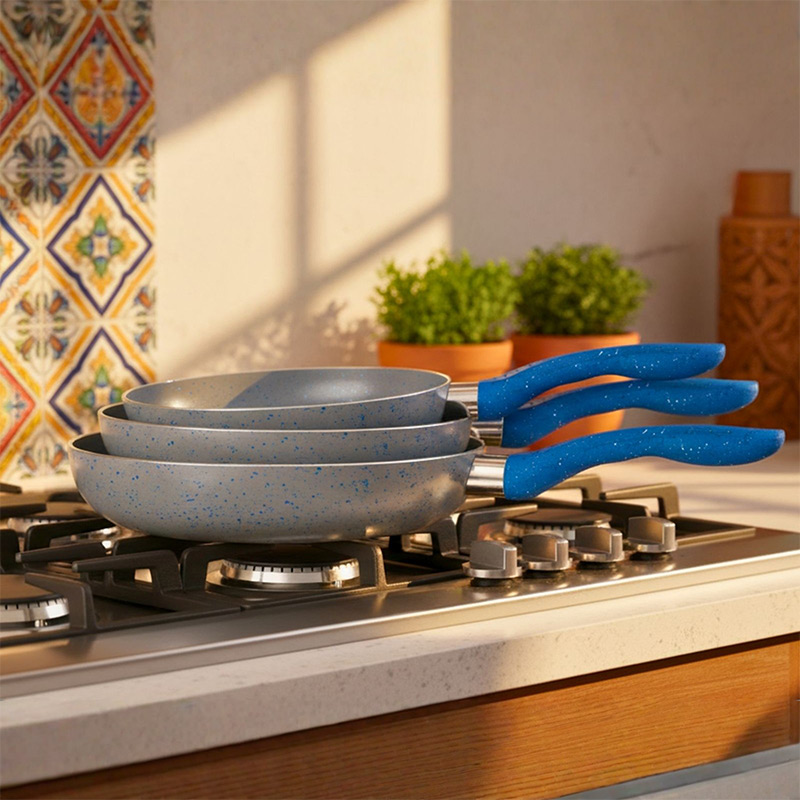 Eleva tu experiencia en la cocina con el set de sartenes Bari, compuesto por tres piezas versátiles en tamaños de 30 cm, 26 cm y 20 cm. Recubrimiento antiadherente de mármol de 4.0 mm de espesor que garantiza una cocción uniforme, sin que los alimentos se peguen, facilitando además la limpieza.