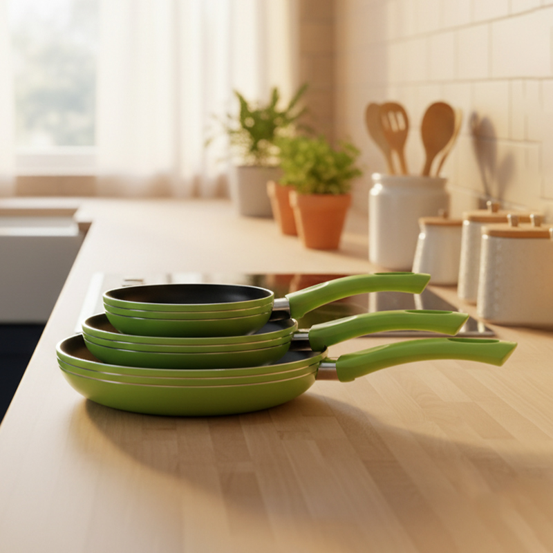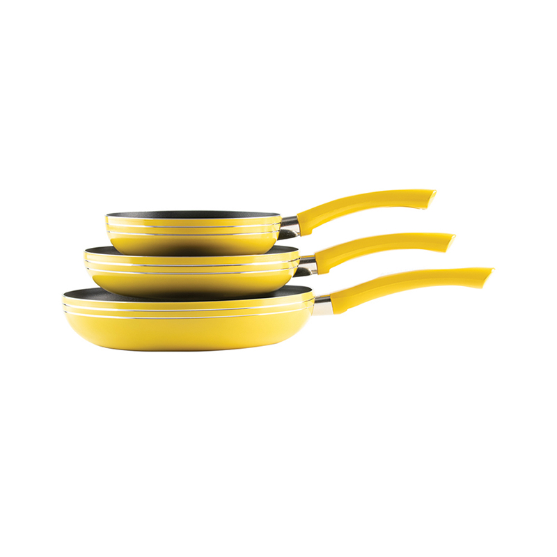Set de sartenes Turin, compuesto con tres piezas de 18, 22 y 26 cm. Cuentan con recubrimiento antiadherente Dyflon de 2.2 mm, resistente y libre de PFOA, que evita que los alimentos se peguen. Sus mangos ergonómicos son resistentes al calor y su diseño vibrante aporta estilo a tu cocina.