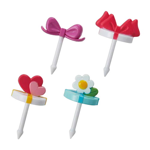 Estos divertidos y bonitos palillos de regalo con lazo le dan una sorpresa especial a cualquier almuerzo bento. Regala alegría cada vez que abran su bento on este set de cuatro palillos: añádelos a sándwiches, frutas, verduras, queso o carnes. Úsalos para crear un almuerzo temático especial, preparar mini brochetas o sujetar wraps o fiambres enrollados.