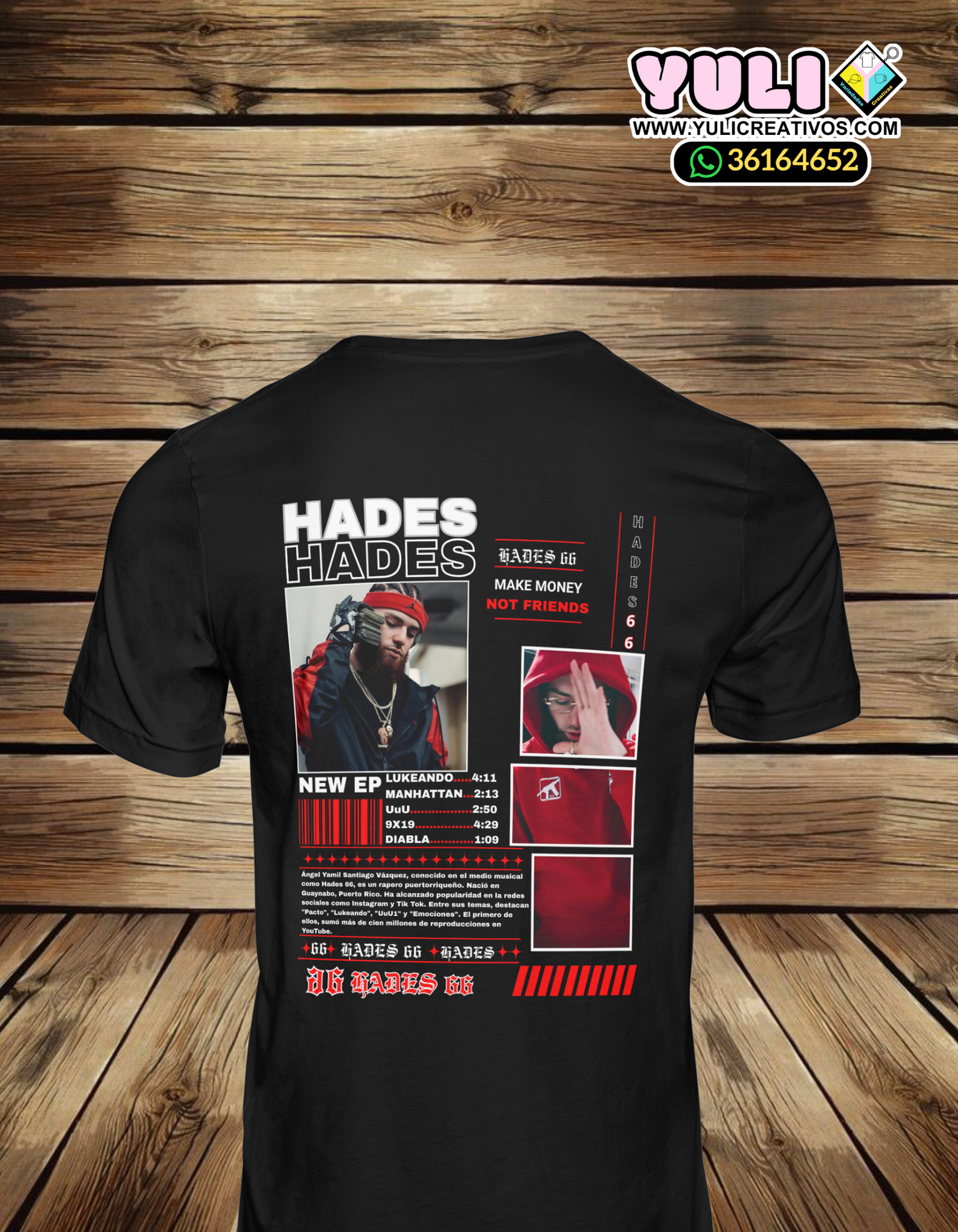 Playera de algodón en color blanco o negro, personalizada de Hades, contiene collage de fotos, texto y gráficos