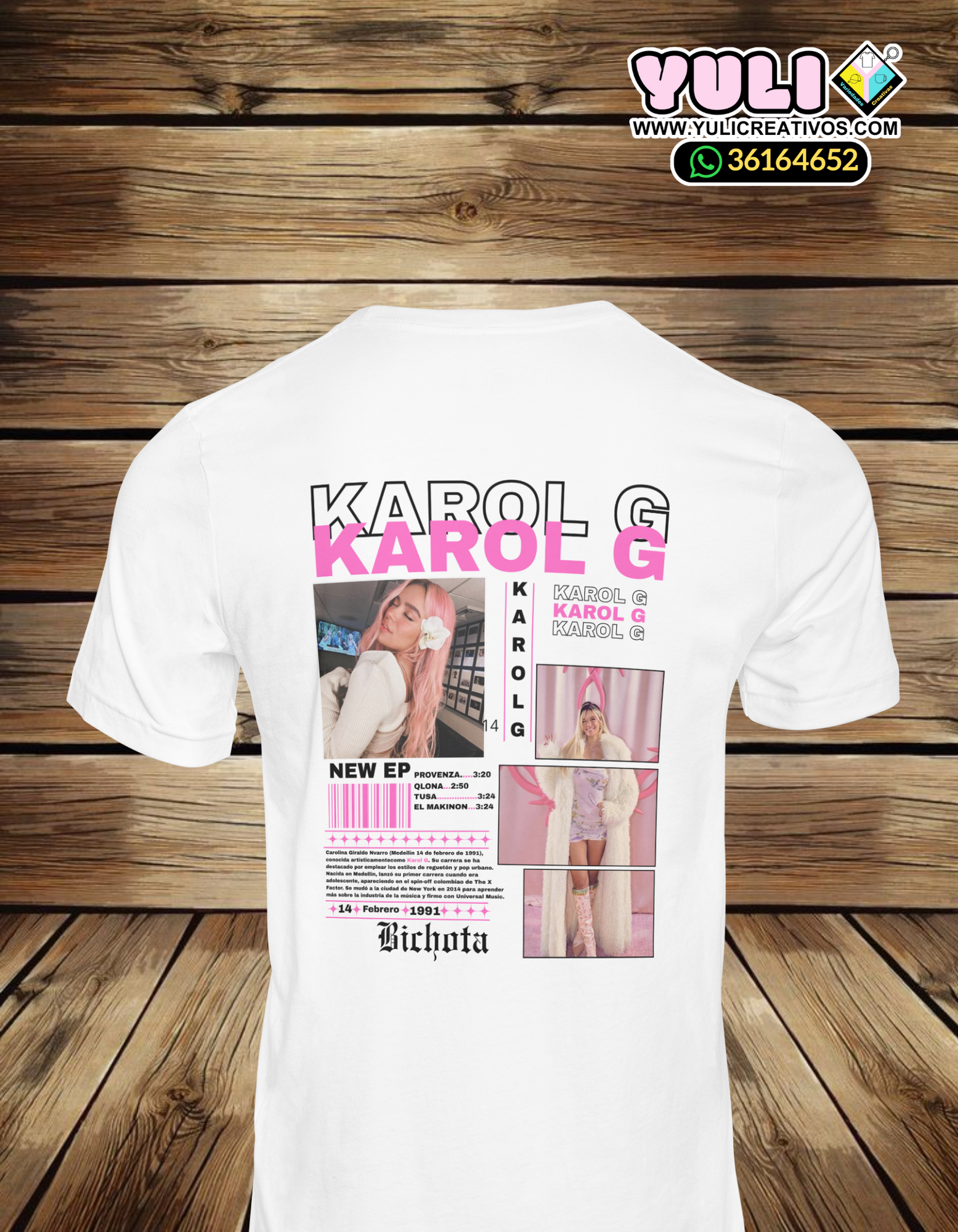 Playera de algodón en color blanco o negro, de la cantante Karol G, contiene fotos, texto y gráficos