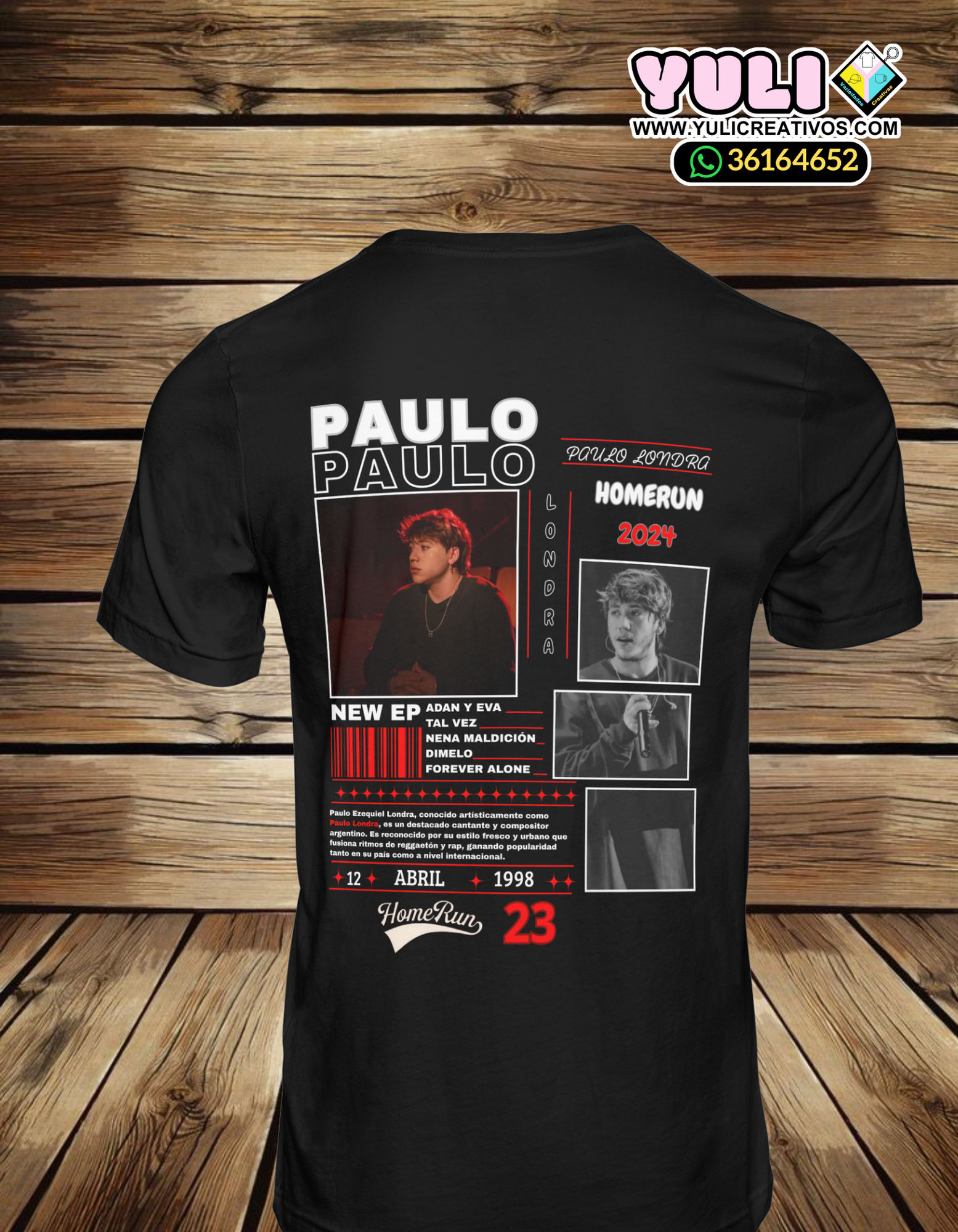 Playera de algodón en color blanco o negro, personalizada de Paulo Londra, contiene collage de fotos, texto y gráficos.