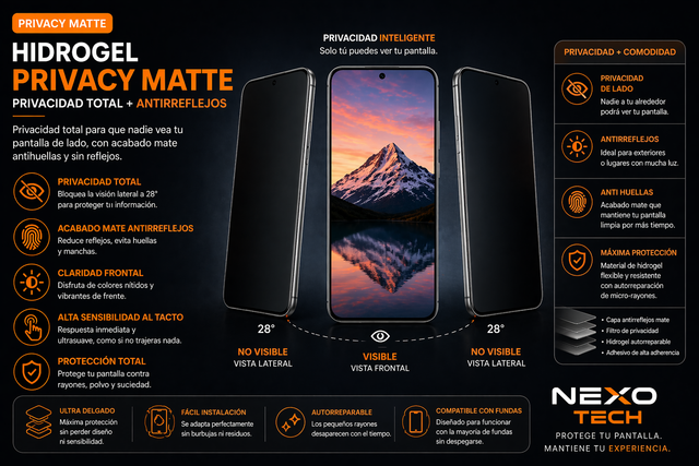 Protege tu información y la pantalla de tu Honor 7 al mismo tiempo. El Hidrogel Privacy Mate combina un filtro espía avanzado (bloquea la visión lateral a 30°) con un elegante acabado mate. Incluye textura antihuellas que facilita el deslizamiento y defensa anti-impactos que no se quiebra al recibir golpes. Ideal para mantener tu privacidad en el transporte público o la oficina.