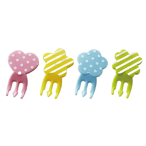 Añade un poco de diversión y color con este precioso juego de ocho pequeños tenedores de comida de tres puntas, con dos de cada uno de cuatro diseños diferentes, que incluyen un corazón rosa con lunares, una estrella amarilla con rayas, una flor azul con lunares y un trébol verde con rayas.