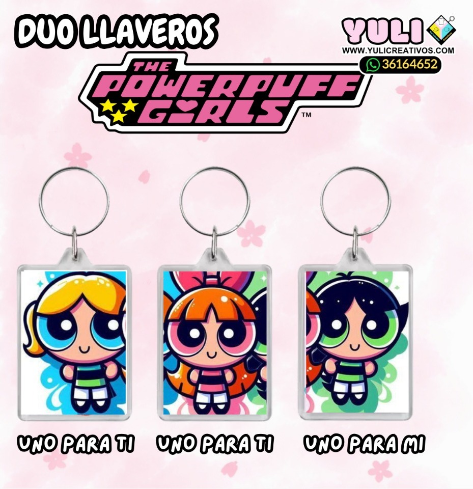 Trio de llaveros acrílicos con temática de Las chicas super poderosas, perfectos para compartir en esta fecha de San Valentín.